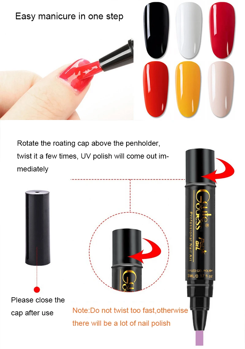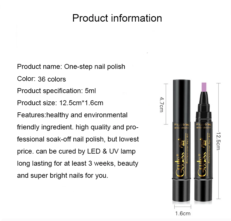 * Healthy and environmental friendly ingredient. * High quality and professional soak-off nail polish, but lowest price. * Can be cured by LED & UV lamp * Long lasting for at least 3 weeks, beauty and super bright nails for you. * Easy remover, just in minute. Specifications:
